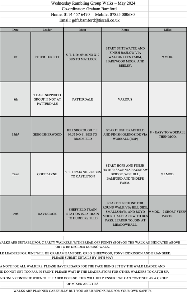 Wednesday Rambling Group for Men, Sheffield – Walks for May 2024 Posted bybolehillbill21st Apr 2024Posted inUncategorized Share this: Click to share on X (Opens in new window) X Click to share on Facebook (Opens in new window) Facebook Like Loading... Related