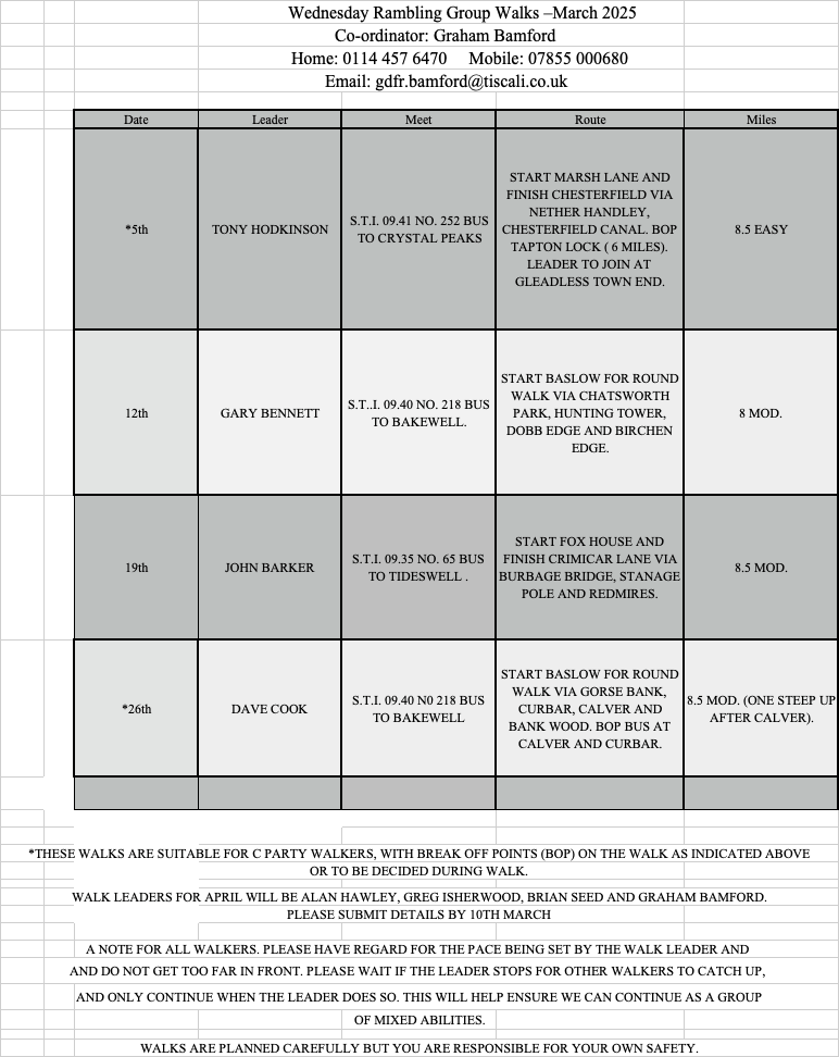 WEDNESDAY RAMBLING GROUP FOR MEN, SHEFFIELD – WALKS FOR APRIL 2025