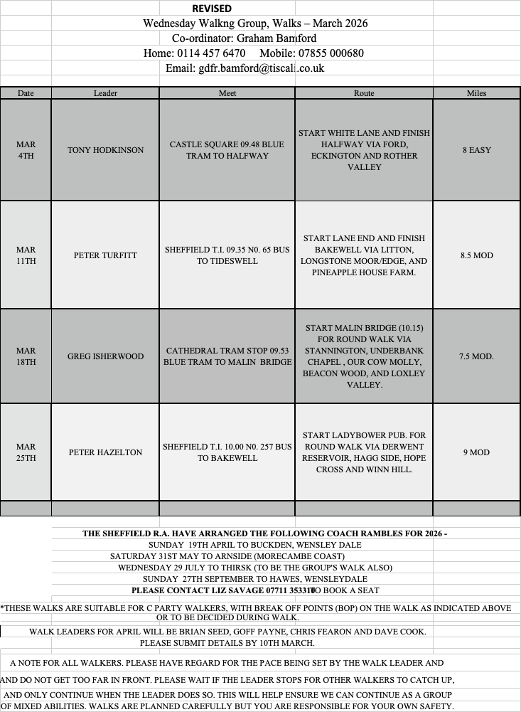 Wednesday Walking Group for Men, Sheffield – Revised list of Walks for March 2026